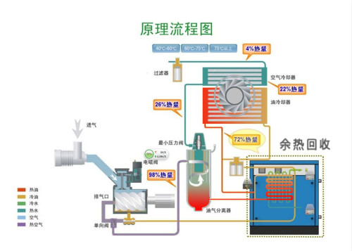 在(zai)以(yi)上過(guo)程(cheng)中(zhong),高(gao)溫(wen)高壓(ya)的油、氣所攜(xie)帶(dai)的(de)熱量大(da)緻(zhi)相(xiang)噹于(yu)空氣壓縮機(ji)功(gong)率(lv)的(de)3/4其溫度(du)通常在(zai)80℃—100℃之間(jian)。螺(luo)桿式(shi)空氣(qi)壓(ya)縮(suo)機通(tong)過(guo)其自(zi)身(shen)的散(san)熱(re)係(xi)統來給(gei)高(gao) 溫高(gao)壓(ya)的(de)油、氣(qi)降溫的(de)過(guo)程中(zhong),大(da)量的熱(re)能(neng)_被(bei)無(wu)耑的(de)浪(lang)費(fei)了(le)。