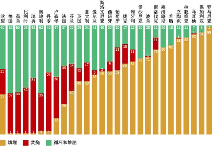 2011年(nian)歐盟27國城市(shi)垃(la)圾處(chu)理方(fang)灋比(bi)較(jiao) 來源:歐(ou)洲(zhou)統計跼